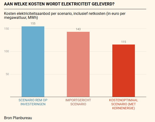 Het goedkoopste kostenplaatje zit toch bij de mix van kernenergie. De volledige kost voor de stroomvoorziening, incl. Netinfrastructuur, bedraagt dan 115 euro / megawattuur. Als we kijken naar de andere scenario’s zit je al snel 25% tot 35% duurder.